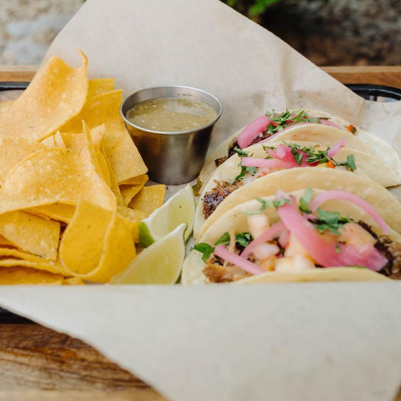 Choice of slow roasted Mexican pork, steak, shredded chicken, or tofu (V), pickled red onions, pineapple salsa and cilantro. Served with chips and salsa verde.