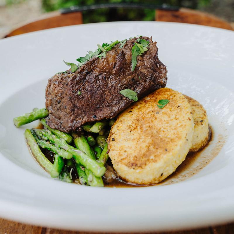Cheesy creamy grits, roasted garlic rainbow carrots, braised beef short rib. Topped with a demi-glace and parsley.