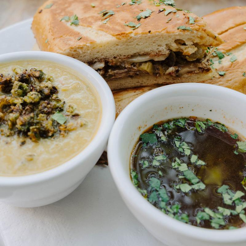 Slow roasted Mexican pork, diced green chilis, pepper-jack on smashed house made French bread with a side of pork dripping au jus.